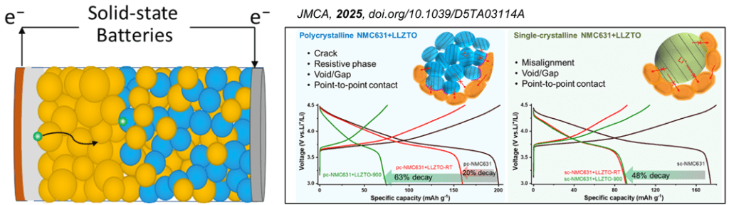 Solid state Li-metal batteries, featuring solid electrolytes and Li-metal anodes, offer enhanced energy density and safety compared to the present Li-ion batteries. In order to advance their practical applications, our focus centers on addressing interfacial issues, particularly electro-chemo-mechanical degradations, to enhance long-term cycling stability.All-solid-state lithium-air batteries offer a theoretical specific energy approaches to that of gasoline. Our work focuses on understanding of reaction mechanisms and dynamic processes of discharge product formation and decomposition at “gas-solid-solid” three-phase interfaces.